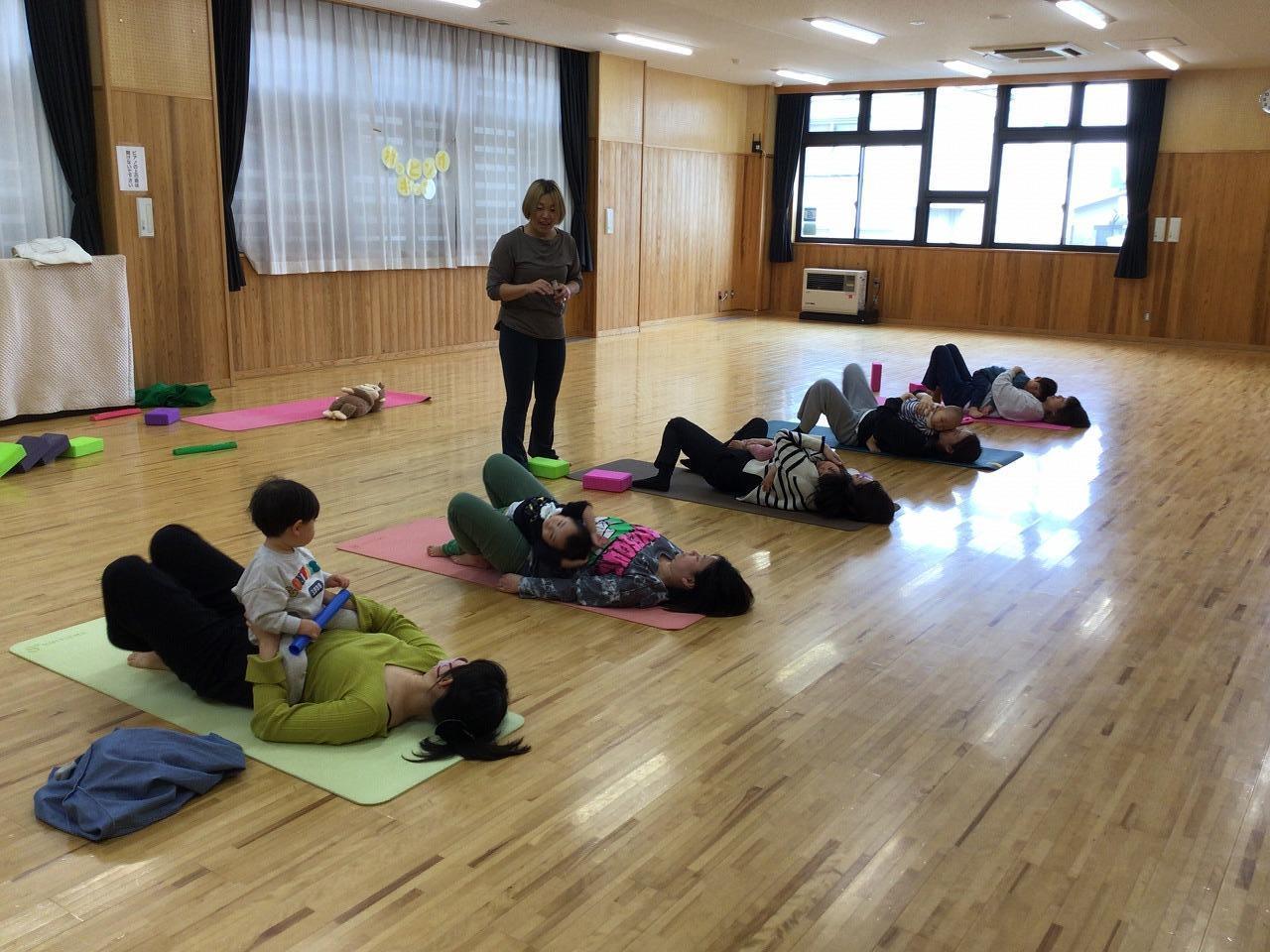 ママヨガタイム♪今日はお尻のあたりをほぐす動きを…。ママからの「ここがツライ…」にアプローチしてくださいます